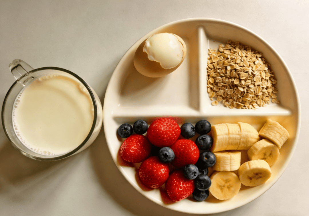早餐应包含优质蛋白质和富含纤维的碳水化合物,如1个水煮蛋、50克燕麦片、200克水果、250毫升纯牛奶。